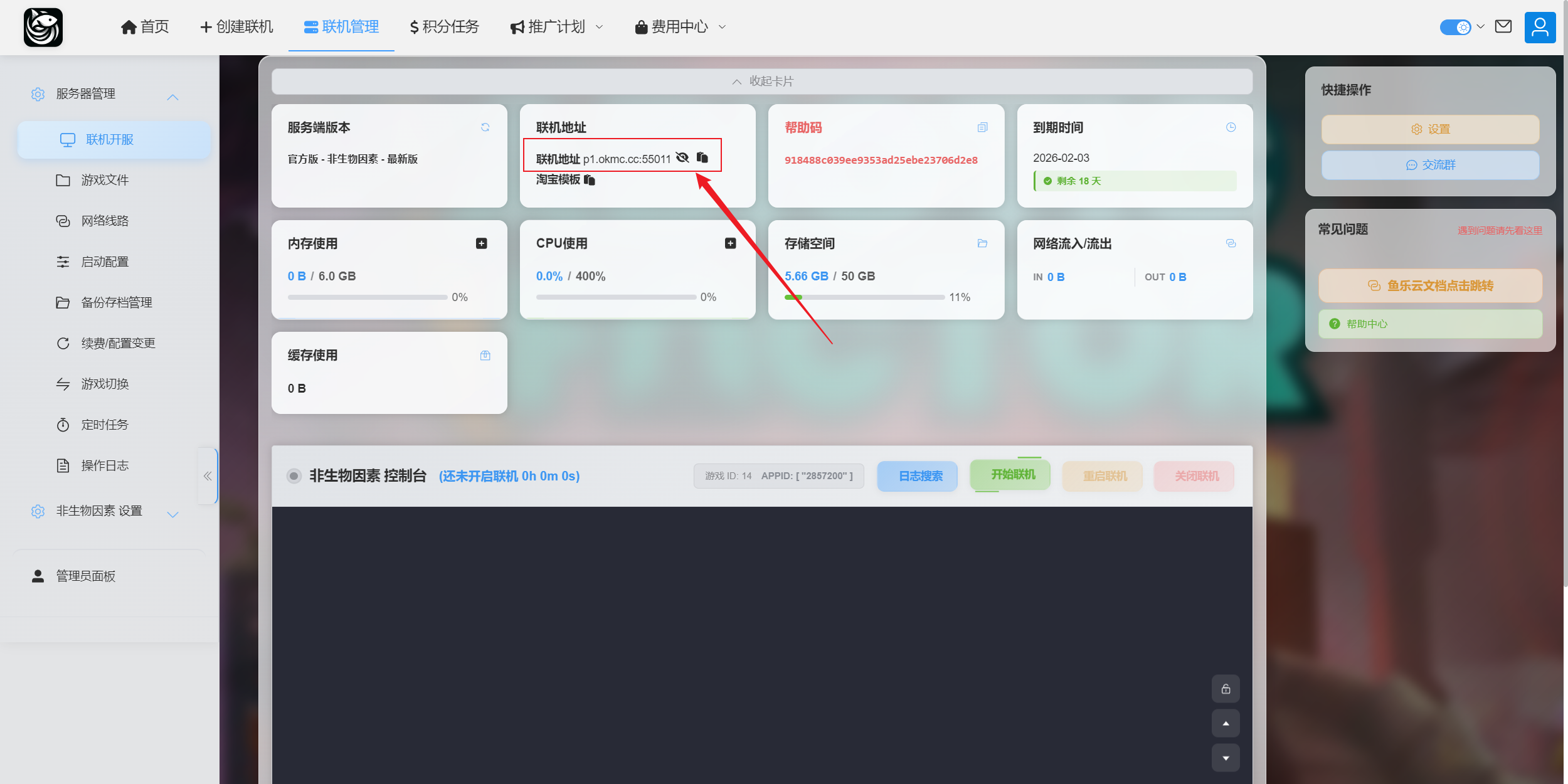 目录 搜索 展开 连接服务器如何上传存档一些其他问题沙盒设置范围如何设置管理员bug收录无法进入服务器看这里 暂无相关搜索结果! 阅读次数: 本文档使用 MinDoc 发布 连接服务器 注意事项:修改游戏设置之前要先进一次服务器,如果不小心没进服就改了,可以重装游戏1 点击进入设施 2 点击加入服务器 3 点击直连 4 点击IP地址 5 例如联机地址为p1.okmc.cc:55001 则IP填写p1.okmc.cc 端口填写55001作者:xiaosu 创建时间:2025-03-20 22:33最后编辑:jiao 更新时间:2026-01-16 23:58