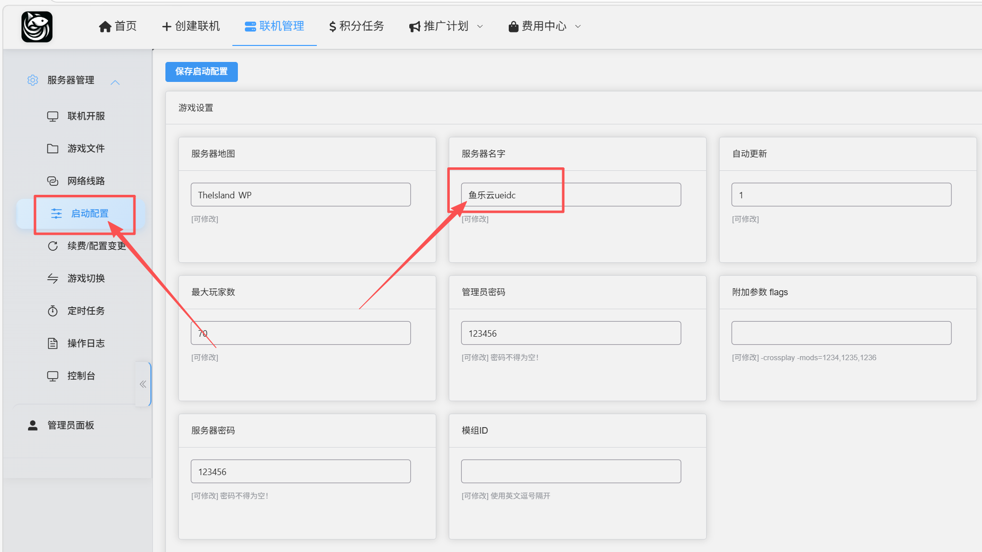 1.进入启动配置修改服务器名字,保存并重启服务器(注:服务器密码和管理员密码不得为空!) 2.等待服务器启动完毕后,打开游戏,点击开始 3.点击加入游戏 在右上角输入服务器名称搜索服务器名字记得勾选带密码保护的服务器以及显示玩家服务器! 搜索到后点击进入即可作者:jiao 创建时间:2026-03-10 20:18最后编辑:jiao 更新时间:2026-03-27 23:43