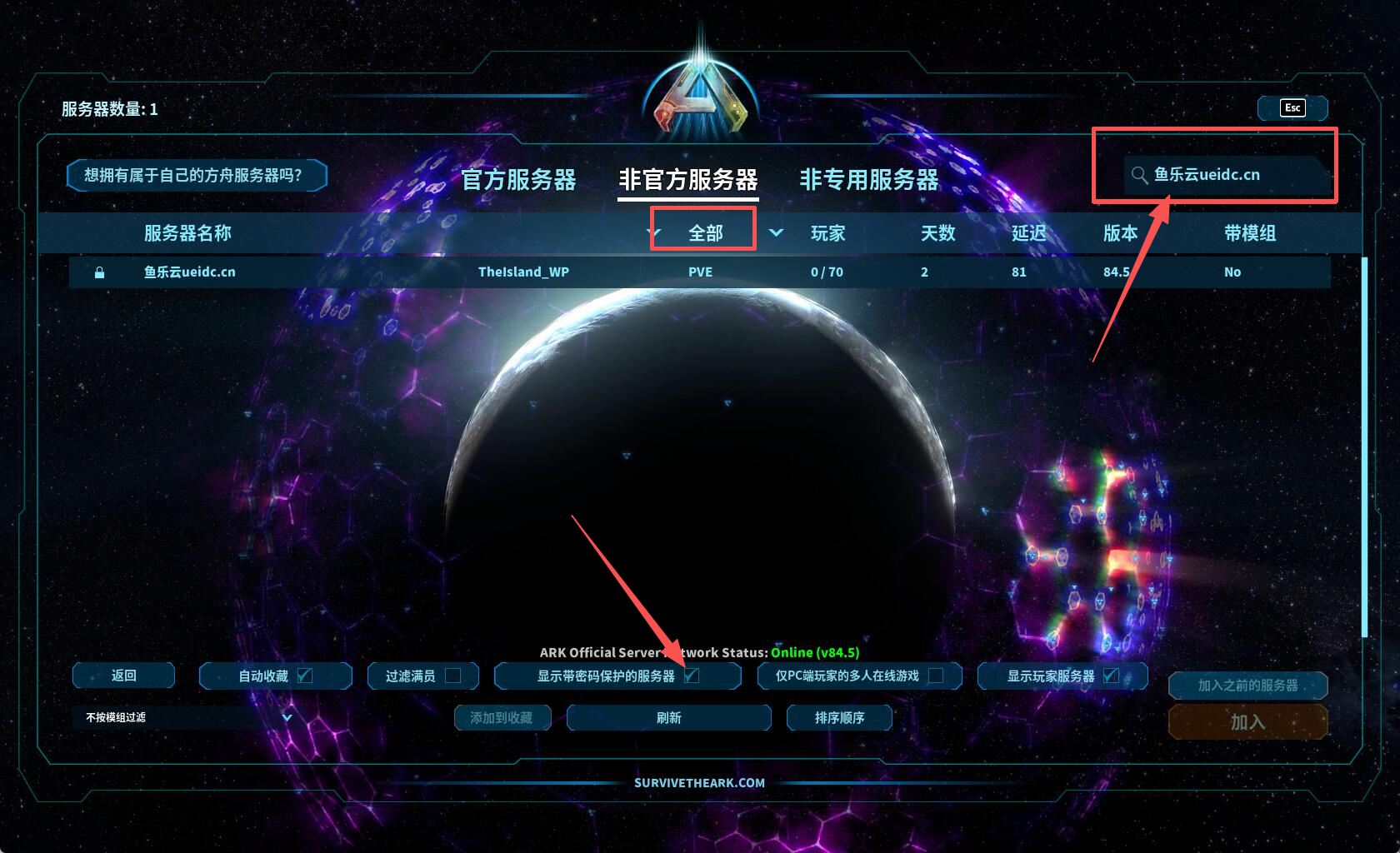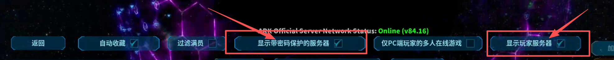 目录 搜索 展开 方舟生存飞升如何进入服务器方舟飞升如何设置服务器参数方舟飞升如何上传存档方舟飞升如何添加模组方舟生存飞升如何切换地图 暂无相关搜索结果! 阅读次数: 本文档使用 MinDoc 发布 方舟生存飞升如何进入服务器 1.进入启动配置修改服务器名字,保存并重启服务器(注:服务器密码和管理员密码不得为空!) 2.等待服务器启动完毕后,打开游戏,点击开始 3.点击加入游戏 在右上角输入服务器名称搜索服务器名字记得勾选带密码保护的服务器以及显示玩家服务器! 搜索到后点击进入即可作者:jiao 创建时间:2026-03-10 20:18最后编辑:jiao 更新时间:2026-03-27 23:43
