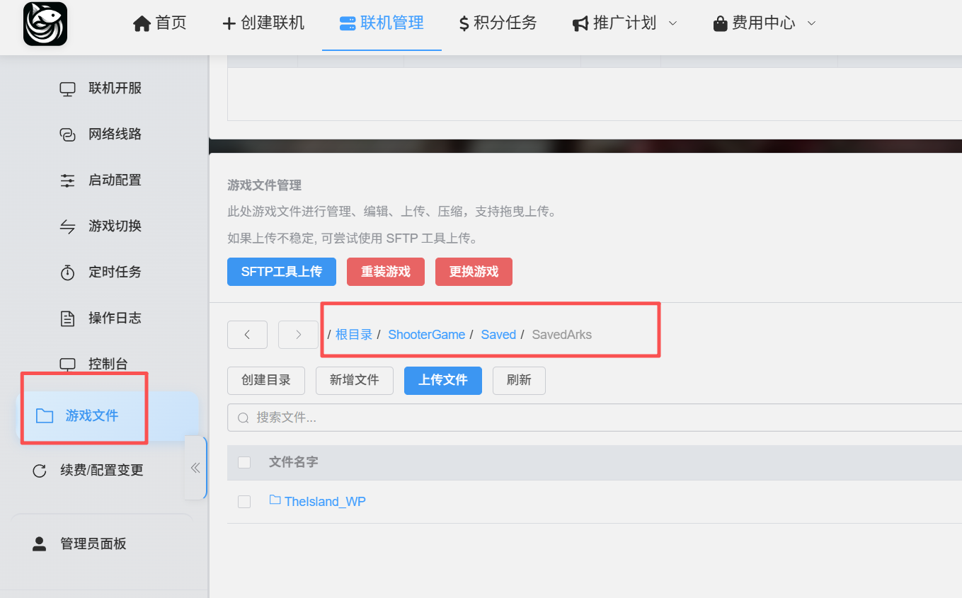 3.进入鱼乐云面板,点击游戏文件,进入框选目录,如果你要上传的存档文件夹名字在面板中有相同的,将面板中对应的文件夹删除,然后将文件夹压缩上传,最后在面板内解压