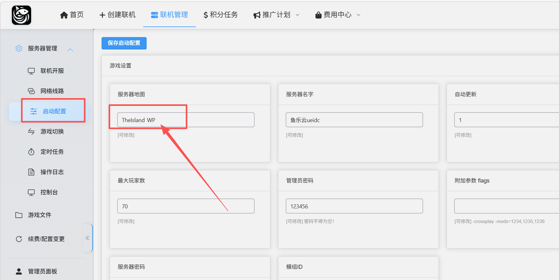 4.点击启动配置,将服务器地图名字改为文件夹一样的名字,即可选择对应存档。 保存后重启服务器即可