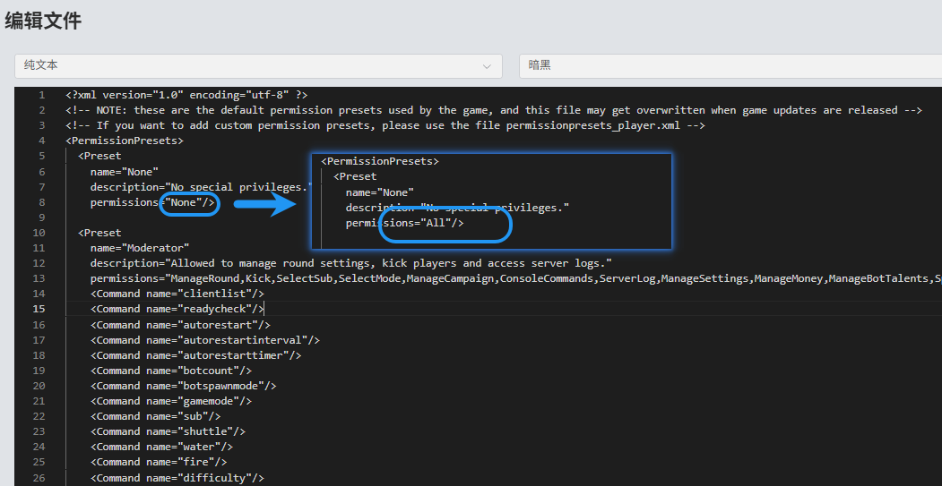 由于这个游戏的权限控制配置对不熟悉文件配置的人不友好,这边只教最简单的来到这个文件下 修改为这样 保存重启服务器关于命令权限进服务器会提示这个 然后叫队友点你名字给权限就行 如果还是没有就重新进一下作者:xiaosu 创建时间:2025-12-08 22:57最后编辑:xiaosu 更新时间:2025-12-09 16:53