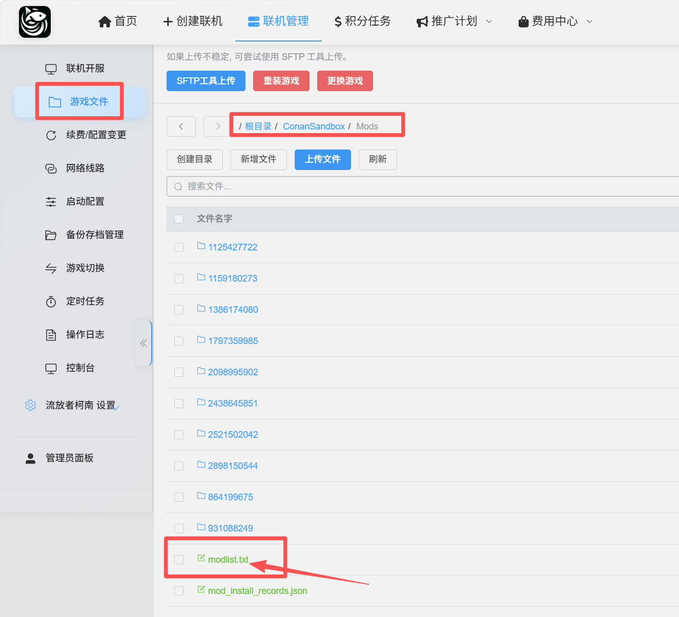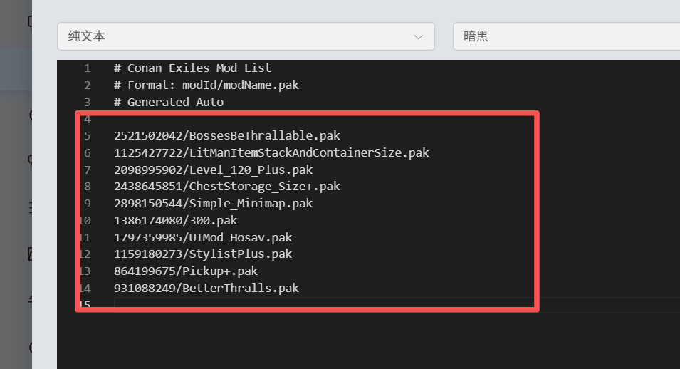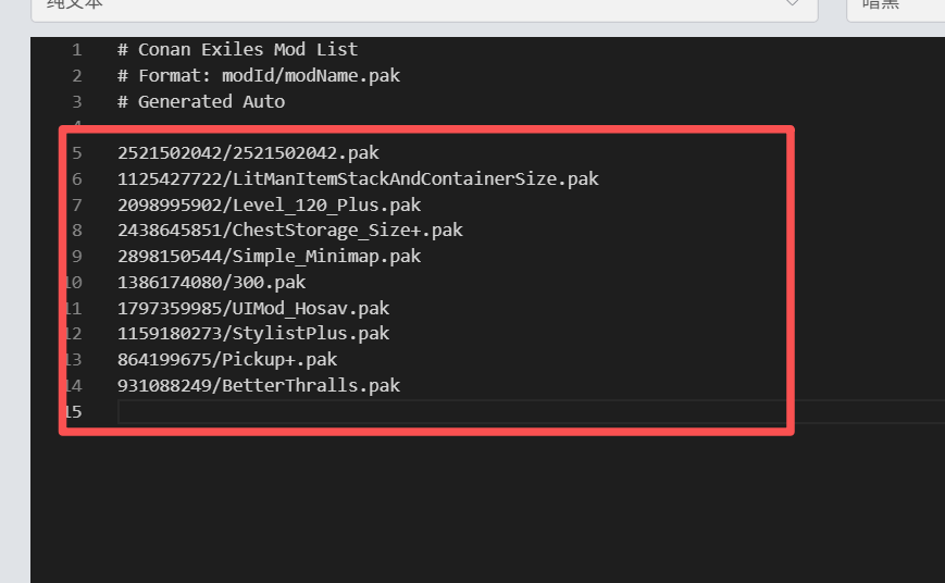 当模组安装后未生效,请点击游戏文件进入框选目录,查看modlist.txt文件 检查文件内容错误内容样式例如:下图第一行 2521502042/2521502042.pak 修改方式,找到对应数字的文件夹,复制里面的pak文件名 重新修改对应modlist文件,保存并重启服务器作者:jiao 创建时间:2026-03-27 21:44最后编辑:jiao 更新时间:2026-03-27 21:53