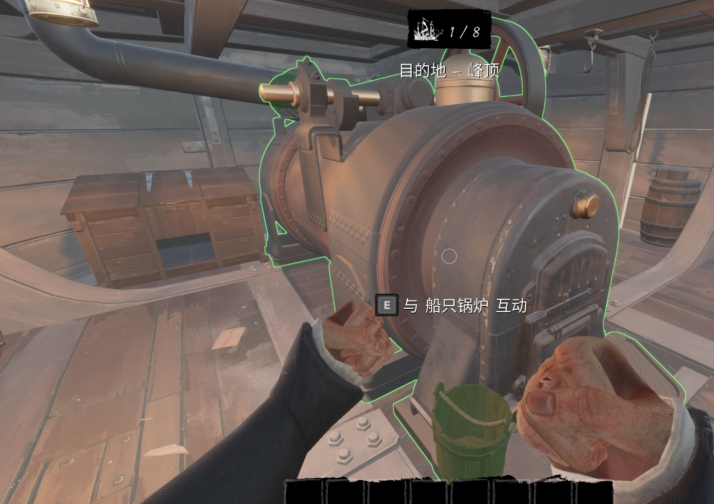 6.发起创建后来到锅炉房,按e跟锅炉互动,点火启动船只