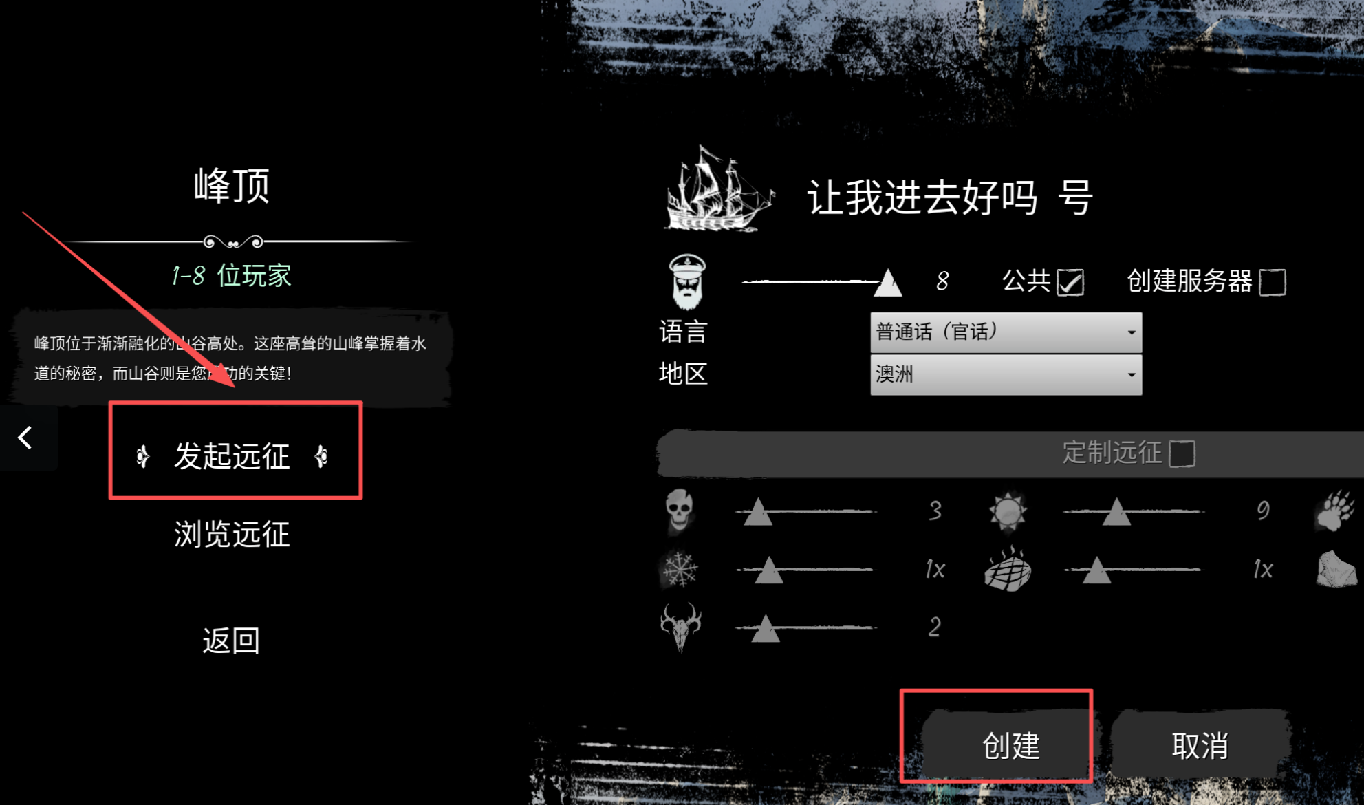 5.点击发起远征,右边可以取消公开和启用公开(这个看个人意愿),然后点创建
