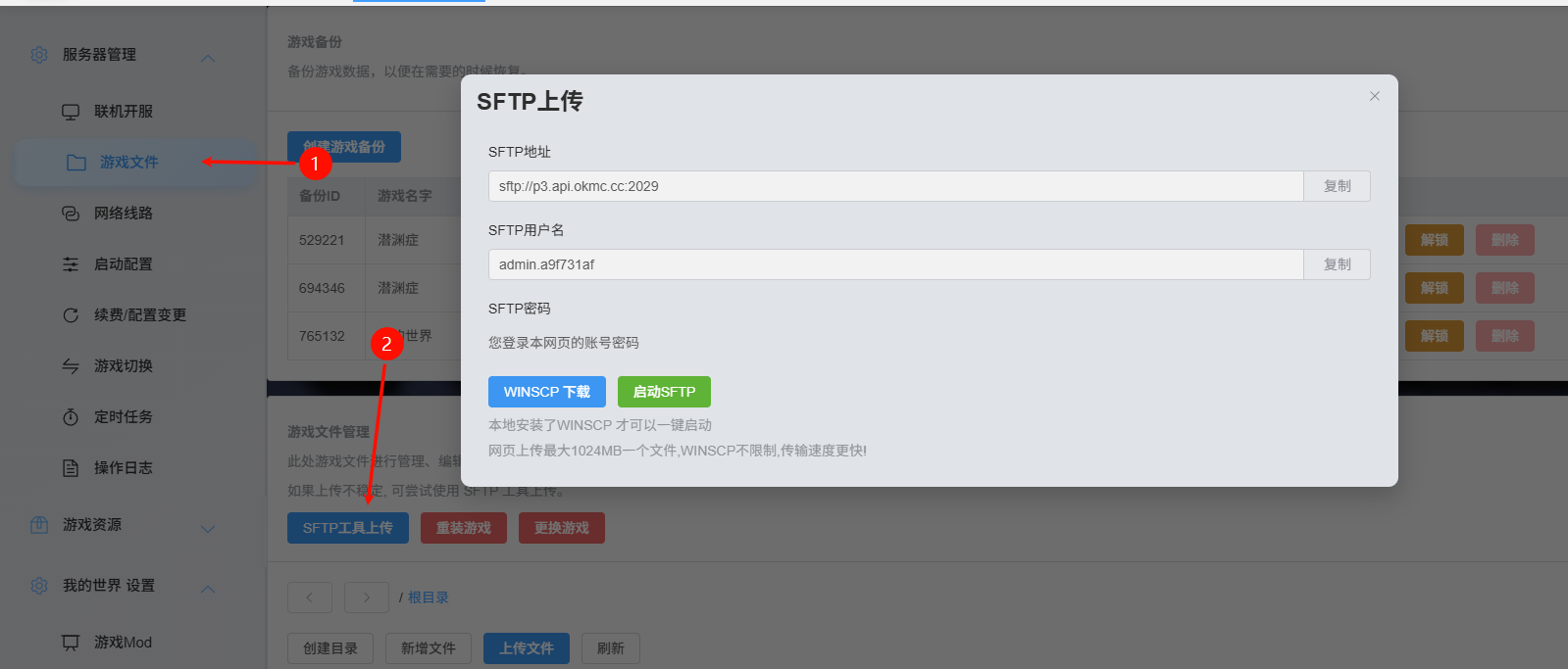 目录 搜索 展开 更多的游戏错误解决都在对应教程下记录通过steam添加服务器时常遇见卡顿网页下载文件太慢服务器进不去我的世界启动时报错steam类游戏连接还是旧版本存档压缩下载本地steam GLST令牌申请sftp怎么打开sftp查看隐藏文件sftp跳转文件技巧饥荒服务器暂时不接受新的连接幻兽帕鲁连接超时一直卡在安装游戏帮助码是什么森林找不到服务器 暂无相关搜索结果! 阅读次数:264 本文档使用 MinDoc 发布 sftp怎么打开 首先确保你已经下载WINSCP打开sftp上传,启动SFTP(注意:记得先下载好工具)密码是你的网站登陆密码 如果用的这个软件,同理,用户名是SFTP用户名 启动后就是这样的,左边是你的电脑,右边是服务器你要上传文件就从左边拖到右边 作者:xiaosu 创建时间:2025-10-21 17:24最后编辑:xiaosu 更新时间:2026-01-15 20:22