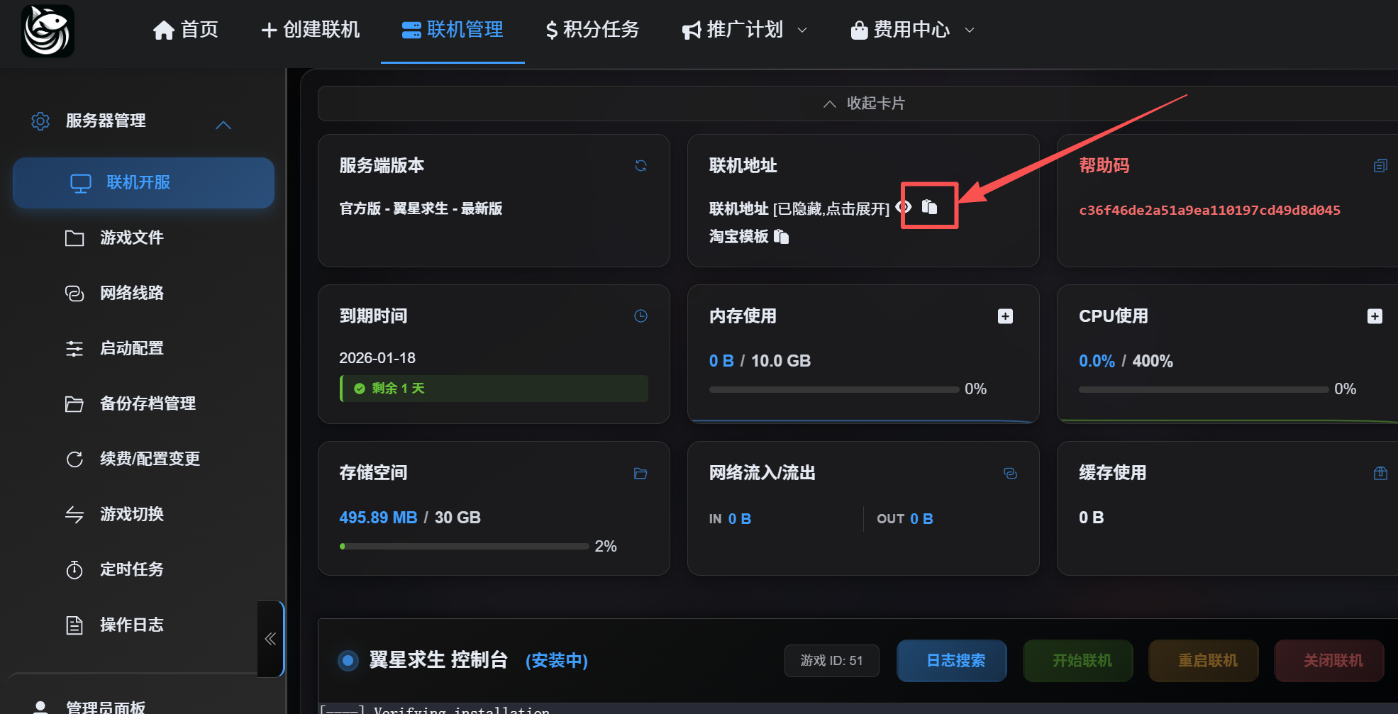 1.进入游戏后点击开始,选择加入 2.打开steam,点击查看,游戏服务器 3.打开鱼乐云游戏面板,复制联机地址 4.点击加号添加,粘贴游戏地址 5.以当前地址为例,请注意!!! 粘贴后请将端口号数字+1以下图为例,端口号为50041,实际要输入的数字则为,50042 6.修改完毕后点击确定 7.最后选择专用服务器,点击收藏界面,即可加入服务器作者:jiao 创建时间:2025-08-07 16:43最后编辑:box 更新时间:2026-01-17 12:36