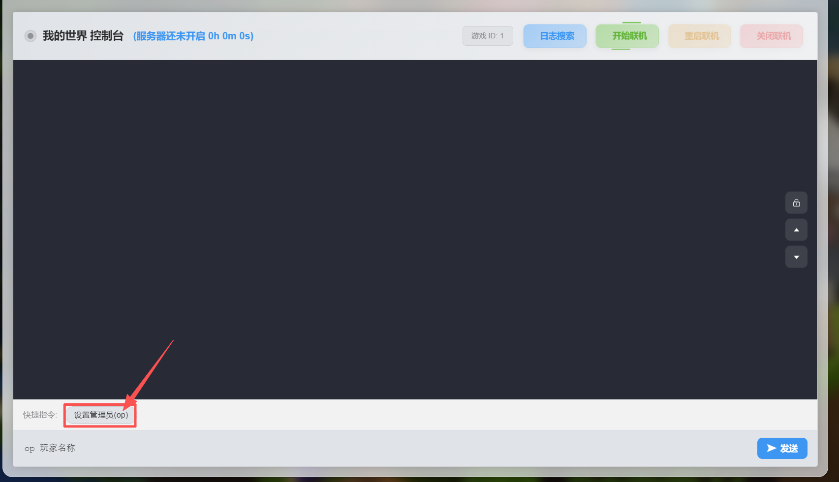 1.开启服务器,找到面板右下角的输入框,点击设置管理员 2.将玩家名称改为自己的游戏名,op前不要带斜杠(/)不要带斜杠(/)不要带斜杠(/)(例如我的用户名叫yuule,则输入op yuule)点击发送可以看到控制台返回信息,将yuule设置为管理员作者:jiao 创建时间:2025-08-14 21:08最后编辑:jiao 更新时间:2026-02-02 09:49