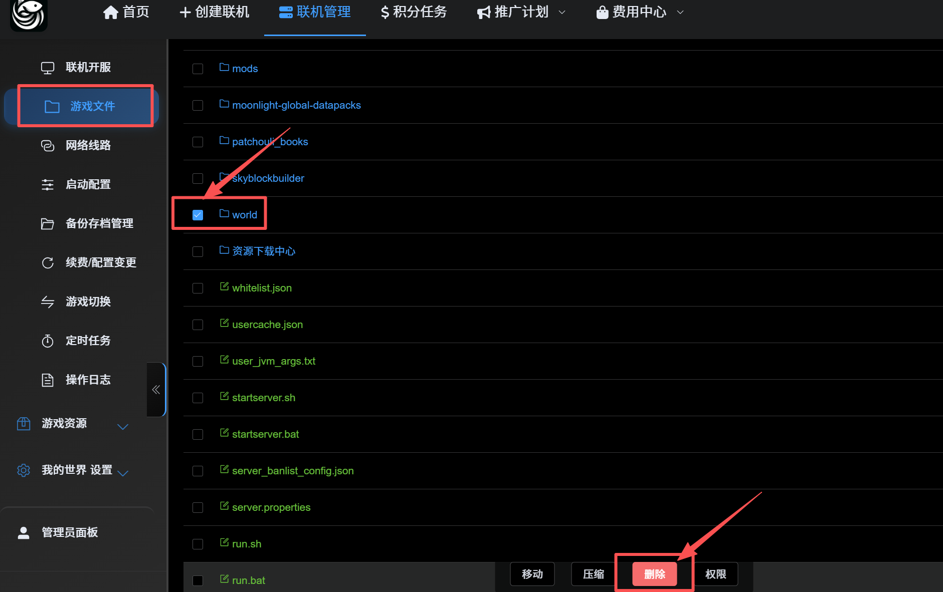 目录 搜索 展开 我的世界面板使用我的世界教程PCL启动器安装教程PCL自动安装整合包(搜索安装)PCL手动安装整合包(压缩包安装)我的世界开服常见问题如何自己上传服务端没有lib如何安装forge包如何使用下载器带有lib的服务端如何开服如何修改服务器配置文件通过修改配置文件解决的常见问题新人常用指令无法进入服务器(正版验证问题)服务器内禁止飞行问题皮肤加载问题(PCL版)启动核心文件不存在如何设置管理员不更改mod删档我的世界宝可梦教程宝可梦(神兽)刷新率设置如何进入究极世界神兽刷新地以及时间常用宝可梦指令常见错误 暂无相关搜索结果! 阅读次数:30 本文档使用 MinDoc 发布 不更改mod删档 !!!先关机!!! 到游戏文件的根目录下面找到world文件夹,然后删掉,最后开机作者:box 创建时间:2026-02-02 09:38最后编辑:box 更新时间:2026-02-02 09:51