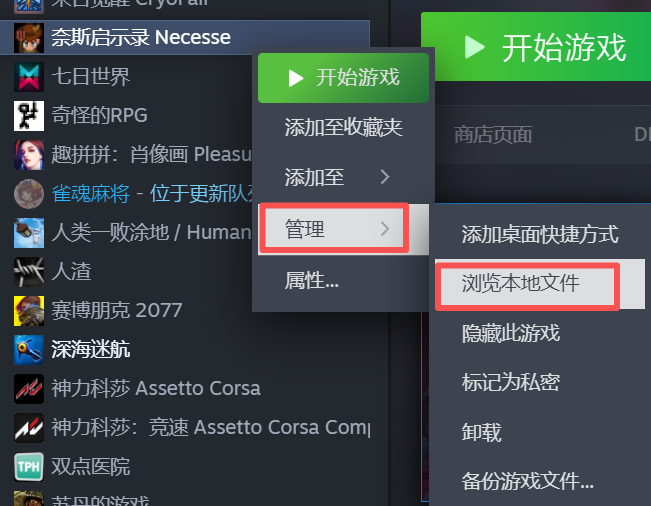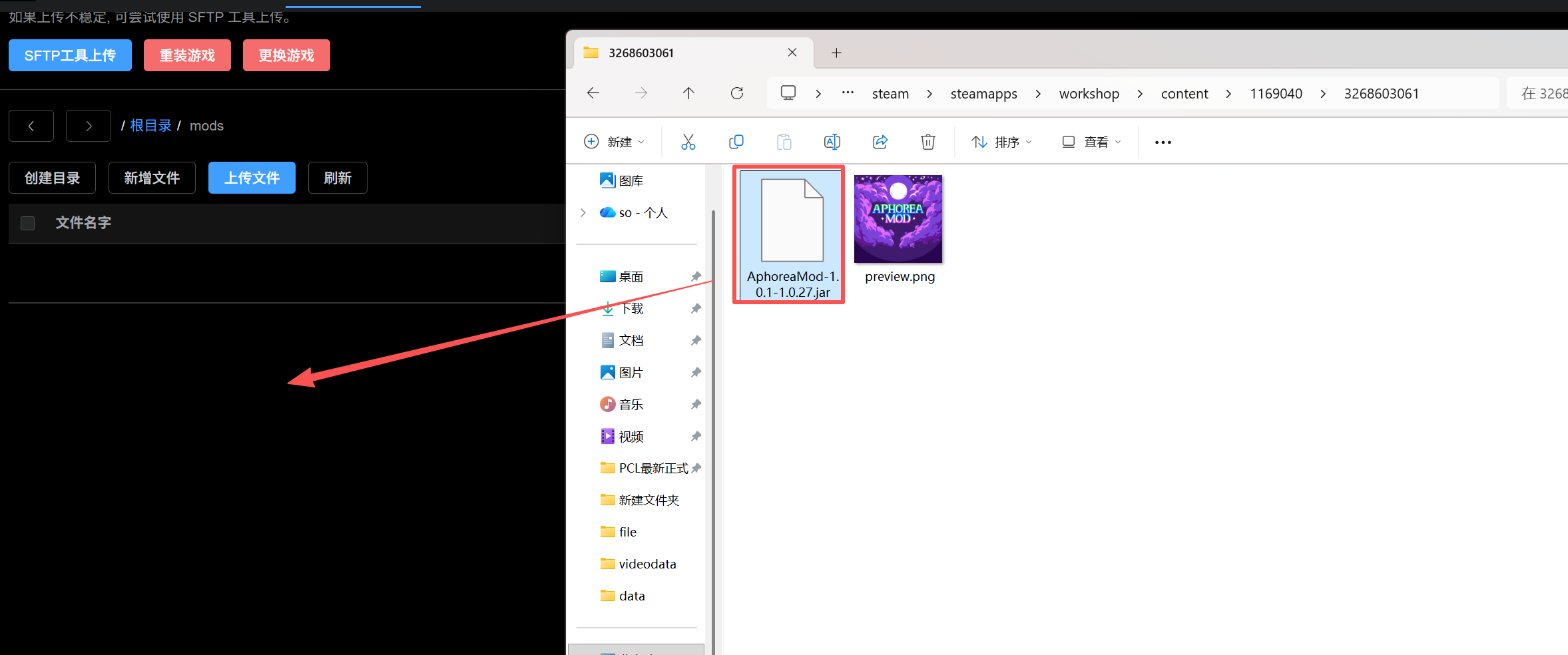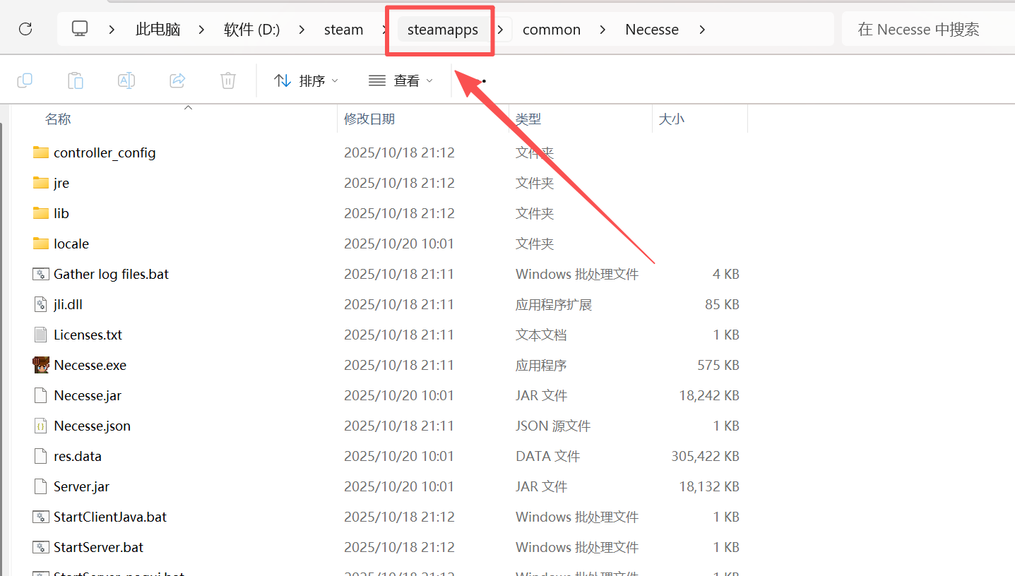 首先右键点击游戏 然后点上面路径里面的“steamapps” 然后根据下图的路径,找到奈斯启示录的本地mod存放位置 来到服务器的游戏文件里 点击创建目录,命名“mods”(如果游戏文件里面有这个文件夹,直接忽略这一步) 然后将本地mod的jar包,放进去 放进去之后的图例作者:box 创建时间:2025-10-20 18:46最后编辑:box 更新时间:2025-12-14 10:48