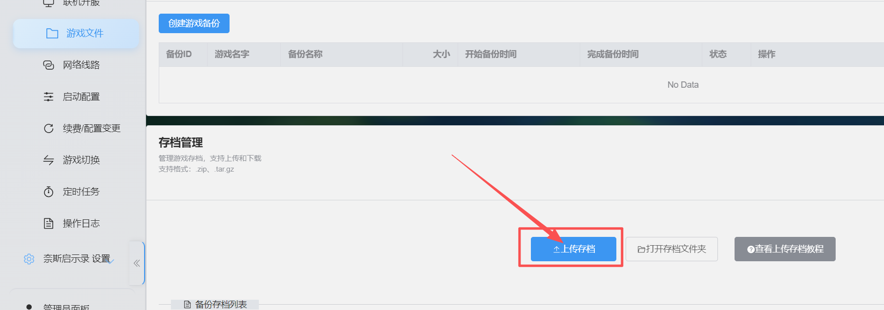 点击上传存档,选择刚才的zip压缩包,上传完成重启服务器即可(上传后的存档文件夹会被改名为save)
