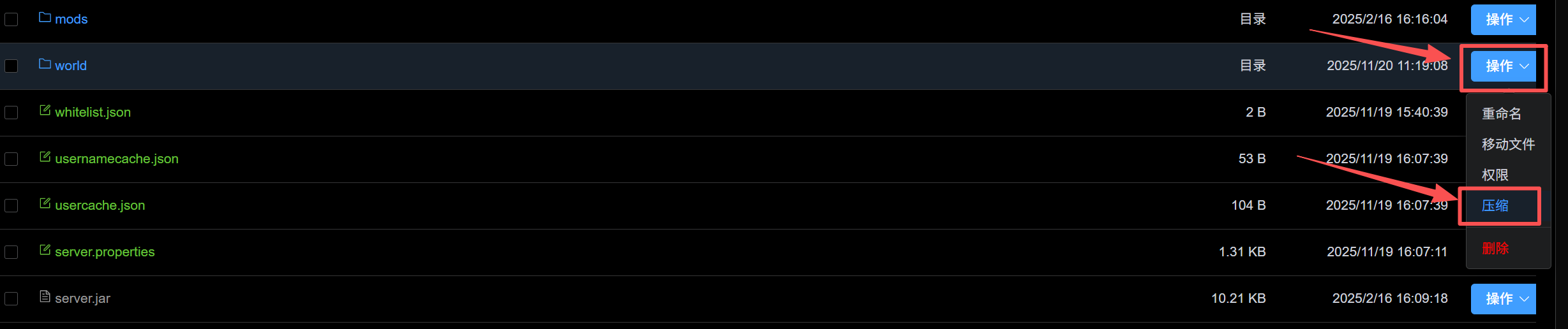 如何压缩文件夹,点右边的操作,点压缩(蓝色字体的是文件夹)