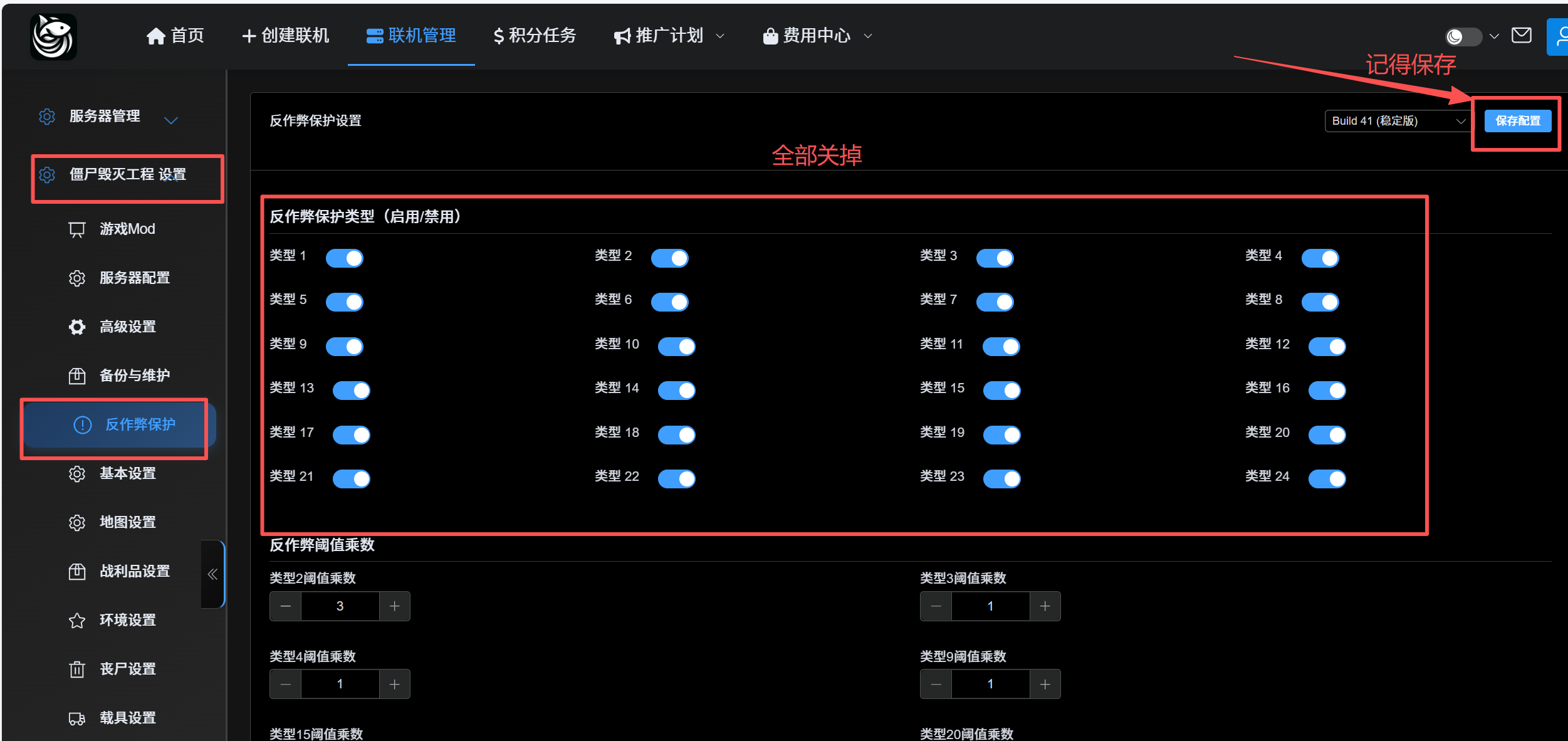 目录 搜索 展开 开服教程(b41)僵尸毁灭工程如何设置管理员如何上传存档如何修改出生坐标如何修改沙盒设置如何修改游戏配置模组相关文档本地如何添加mod如何上传模组到服务端地图mod上传(先看模组上传那篇)如果在开机的时候崩溃本地的服务器账号密码记录格式错误数据被踢(数字类型错误)不更改mod的前提下删档重开ping值太高被踢地图全开和开小地图中途添加新的出生点(不推荐)僵尸毁灭工程b42僵尸毁灭工程b42如何设置管理员僵尸毁灭工程b42如何进入服务器僵尸毁灭工程b42如何修改沙盒设置僵毁b42手动添加mod(原理)连接时出现的问题(lua校验) 暂无相关搜索结果! 阅读次数:762 本文档使用 MinDoc 发布 格式错误数据被踢(数字类型错误) 如果遇到下图的问题 方法一首先关机,到服务器,游戏文件里面找服务器配置文件,然后编辑路径:根目录/.cache/Server文件名:server.ini(前缀名是配置文件名,后缀是ini) 键盘按ctrl + f 搜索 “anticheat” 将1-24的true,改成false改前图例 改后图例 编辑后保存,开机方法二 保存后,重启作者:box 创建时间:2025-08-10 16:35最后编辑:box 更新时间:2026-01-29 15:50