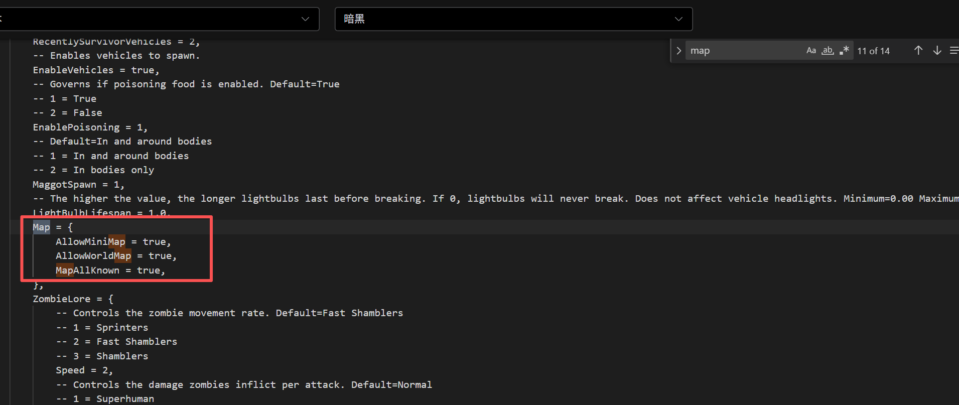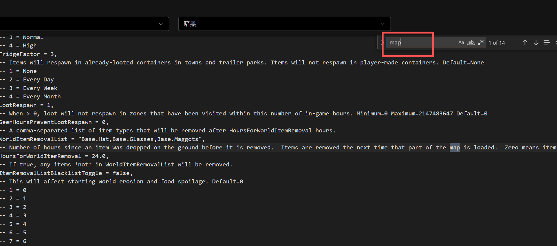 来到sandboxvars文件路径:/根目录/.cache/Server文件名:server_SandboxVars.lua (前缀是你设置的配置文件名,后缀是lua) 点右边的操作,点编辑,然后在里面键盘按ctrl+f弹出搜索框,输入map 找这串东西 改前图例 改后图例作者:box 创建时间:2025-10-22 17:40最后编辑:box 更新时间:2025-12-09 21:39