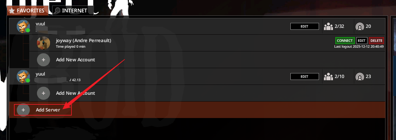 目录 搜索 展开 开服教程(b41)僵尸毁灭工程如何设置管理员如何上传存档如何修改出生坐标如何修改沙盒设置如何修改游戏配置模组相关文档本地如何添加mod如何上传模组到服务端地图mod上传(先看模组上传那篇)如果在开机的时候崩溃本地的服务器账号密码记录格式错误数据被踢(数字类型错误)不更改mod的前提下删档重开ping值太高被踢地图全开和开小地图中途添加新的出生点(不推荐)僵尸毁灭工程b42僵尸毁灭工程b42如何设置管理员僵尸毁灭工程b42如何进入服务器僵尸毁灭工程b42如何修改沙盒设置僵毁b42手动添加mod(原理)连接时出现的问题(lua校验) 暂无相关搜索结果! 阅读次数:517 本文档使用 MinDoc 发布 僵尸毁灭工程b42如何进入服务器 1.steam点击属性 2.点击测试版,选择unstable,等待下载完成 3.点击MULTIPLAYER 4.点击Add Server 5.按照服务器地址,填写方框,如果在面板设置了服务器密码,密码也在这里输入 服务器名称随便填 6.点击Add New Account创建新用户,填写用户名和密码,框选的位置最好不要勾 最后,点击connect,即可进入游戏作者:jiao 创建时间:2025-12-06 21:27最后编辑:jiao 更新时间:2026-01-29 15:50