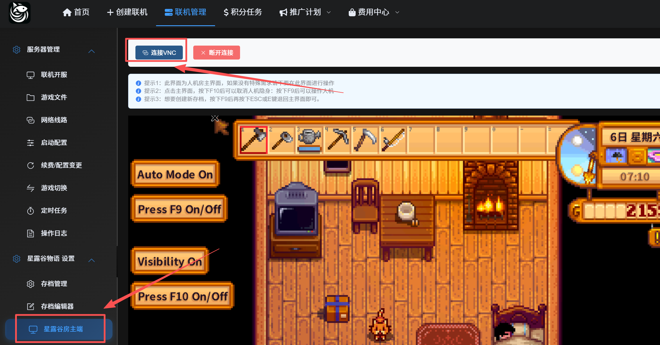 1.点击游戏管理,星露谷房主端,点击连接vnc