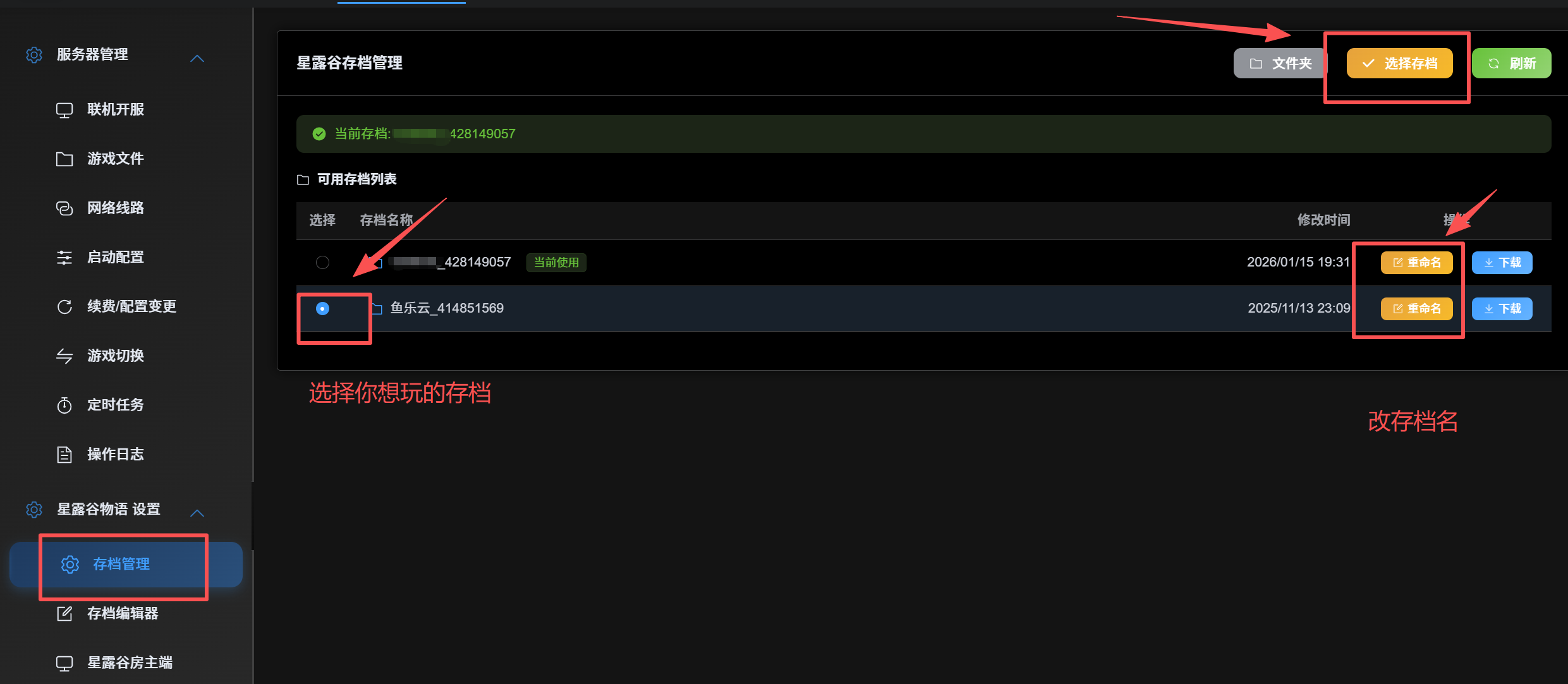 最后,回到存档管理,点击刷新,查看新创建的存档,勾选后,点击选择。则表示以后重启服务器都加载当前存档。