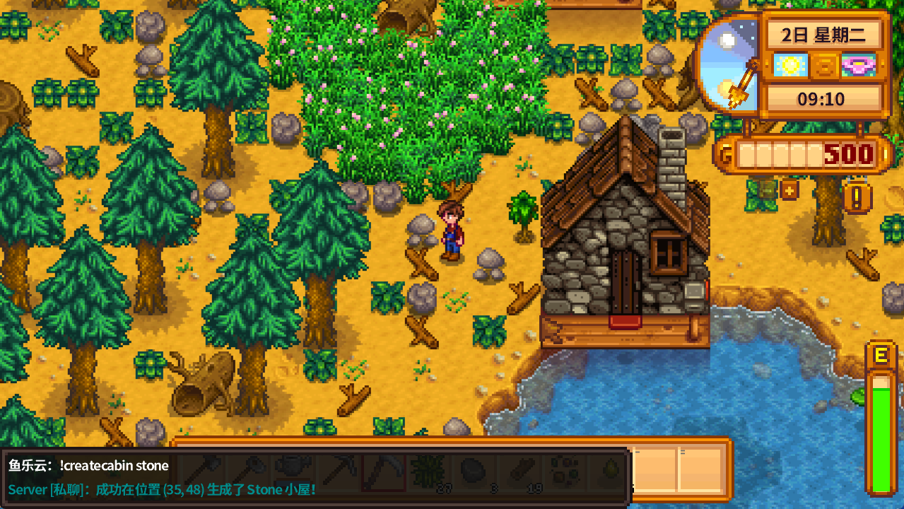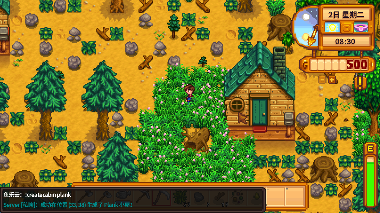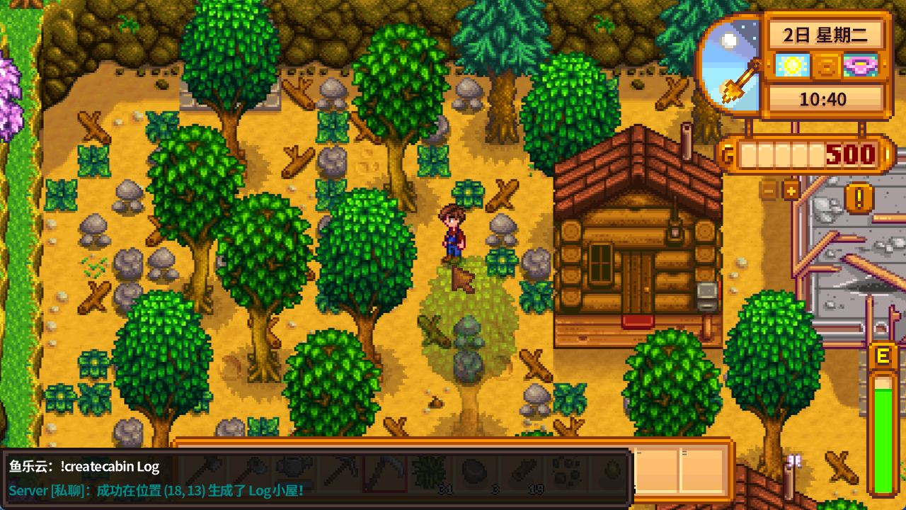 目录 搜索 展开 目录注意事项新建存档教程星露谷两个类型如何选择?星露谷如何进入服务器模组相关本地下载星露谷模组模组上传到服务器版本问题存档上传存档上传如何修改经济共享或独占如何加入joja会员如何选择山洞如何使服务器自动加载自己的新存档如何通过指令添加联机小屋如何通过指令移动建筑如何关闭游戏内的聊天提示节日相关如何进行节日 暂无相关搜索结果! 阅读次数:401 本文档使用 MinDoc 发布 如何通过指令添加联机小屋 当联机小屋不够,没有多余空位让新玩家进入时,可以添加新的联机小屋使得朋友能够进入只需要在游戏内打开聊天框,输入指令 !createcabin 即可在自己身旁自动生成联机小屋(默认为Log) 同时也可以通过以下指令自己选择对应小屋样式 !createcabin Log !createcabin plank !createcabin stone 作者:jiao 创建时间:2025-11-19 15:55最后编辑:jiao 更新时间:2026-01-22 10:36