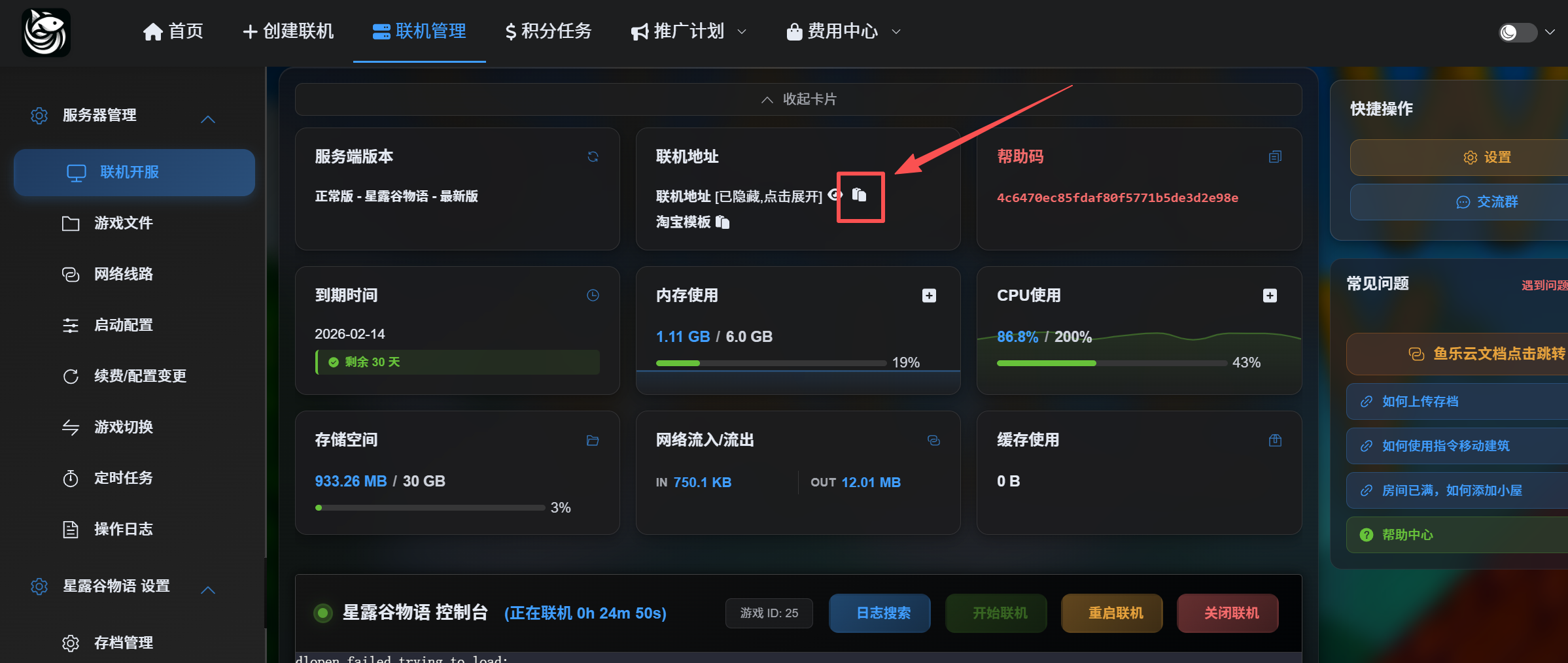 设置好参数之后可点击开机键进行开服,出现“Server started”说明开服成功