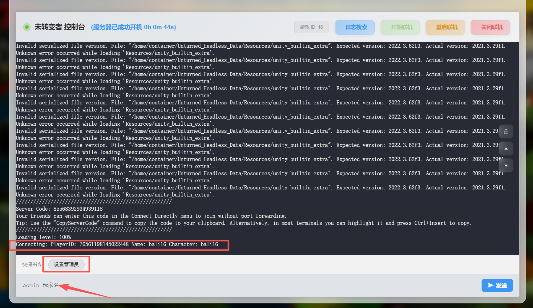 当你刚进入服务器时,会显示你的登录信息,里面包含你的游戏名称以及playerID点击设置管理员按钮,将玩家名改为自己的游戏名称或者playerID,点击发送,即可设置为管理员 设置成功会有成功提示,如果要使用作弊指令,还需要额外设置允许作弊作者:jiao 创建时间:2026-01-27 23:35最后编辑:jiao 更新时间:2026-01-29 20:38