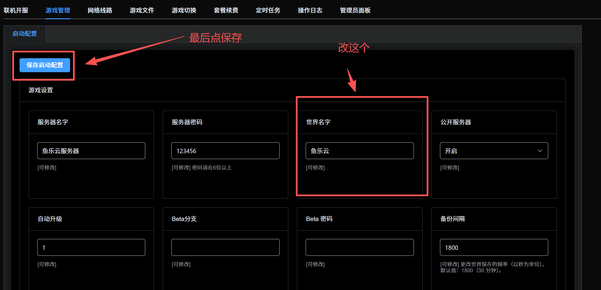 目录 搜索 展开 如何开服进游戏上传存档并连接服务器安装模组教程设置管理员作弊模组配置要求常见问题不更改mod删档 暂无相关搜索结果! 阅读次数:45 本文档使用 MinDoc 发布 不更改mod删档 方法一:来到该路径,全选文件,删掉(注意不是根目录,一定要看路径,很多人都是直接在根目录删全部文件) 方法二:在游戏管理修改地图名字,修改后记得重启作者:box 创建时间:2026-01-10 18:28最后编辑:box 更新时间:2026-01-10 18:31