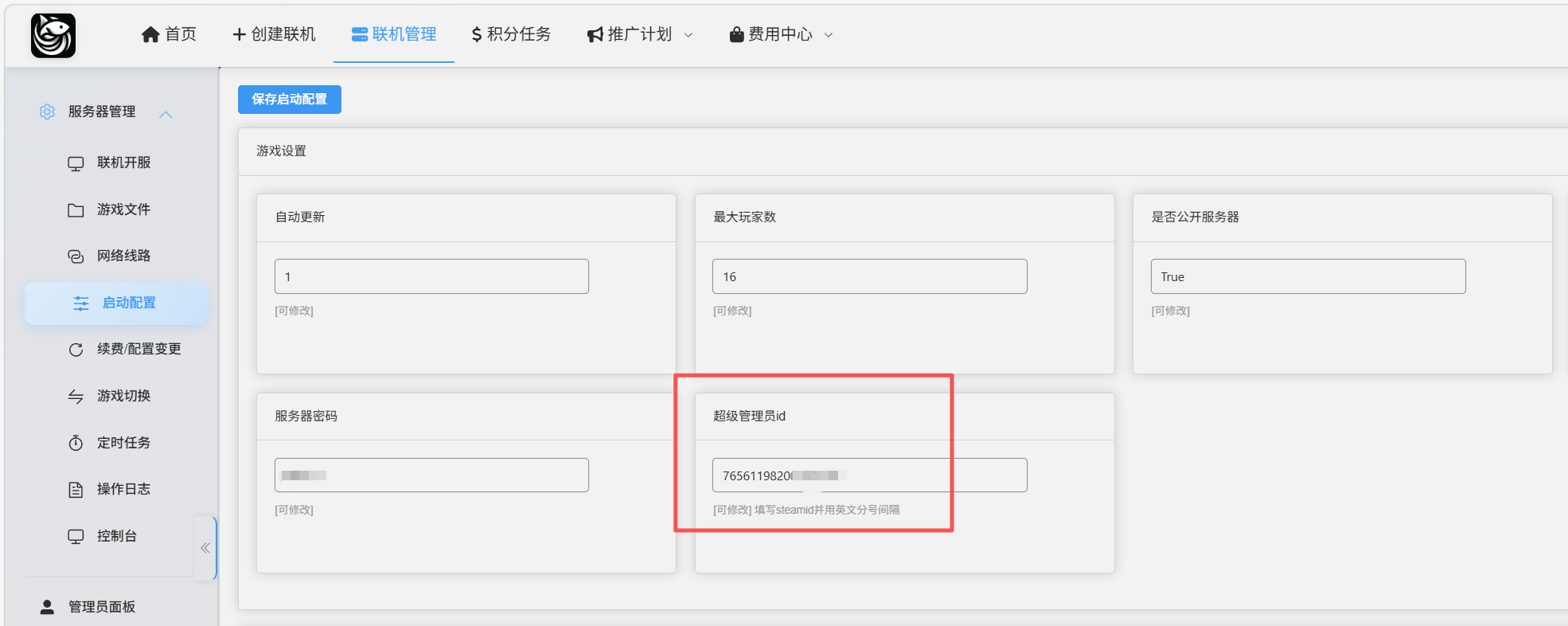 1.进入鱼乐云面板,点击启动配置 2.填写你的steamid例如我的steamid为76561198200123456,则填写76561198200123456最后保存并重启服务器作者:jiao 创建时间:2026-03-02 22:03最后编辑:jiao 更新时间:2026-03-02 22:25